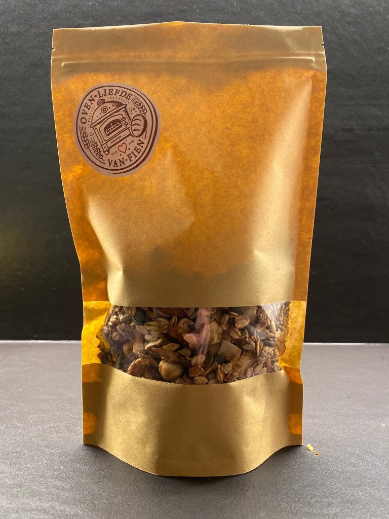 € 8 voor 300gr Natuur, € 9 voor 300gr Chocolade, verpakt in een hersluitbaar zakje.