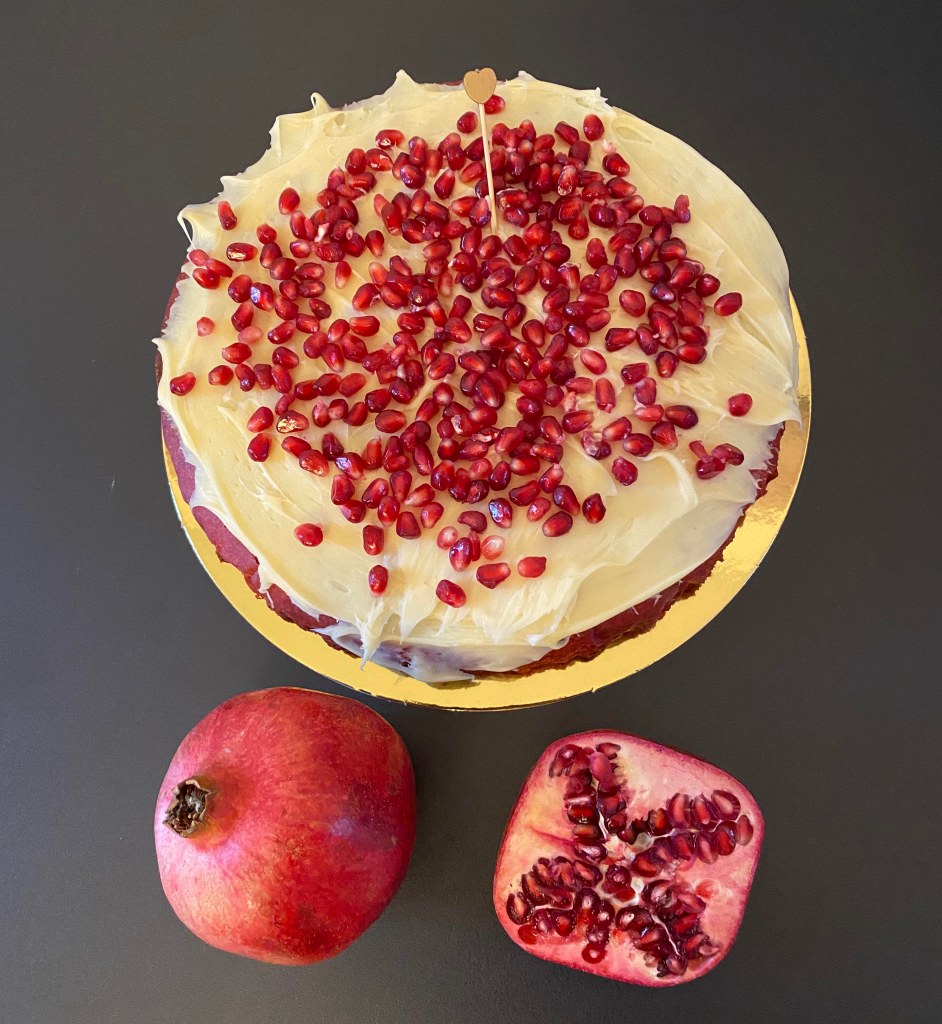 Red Velvet met witte chocolade topping en granaatappel ~> € 26